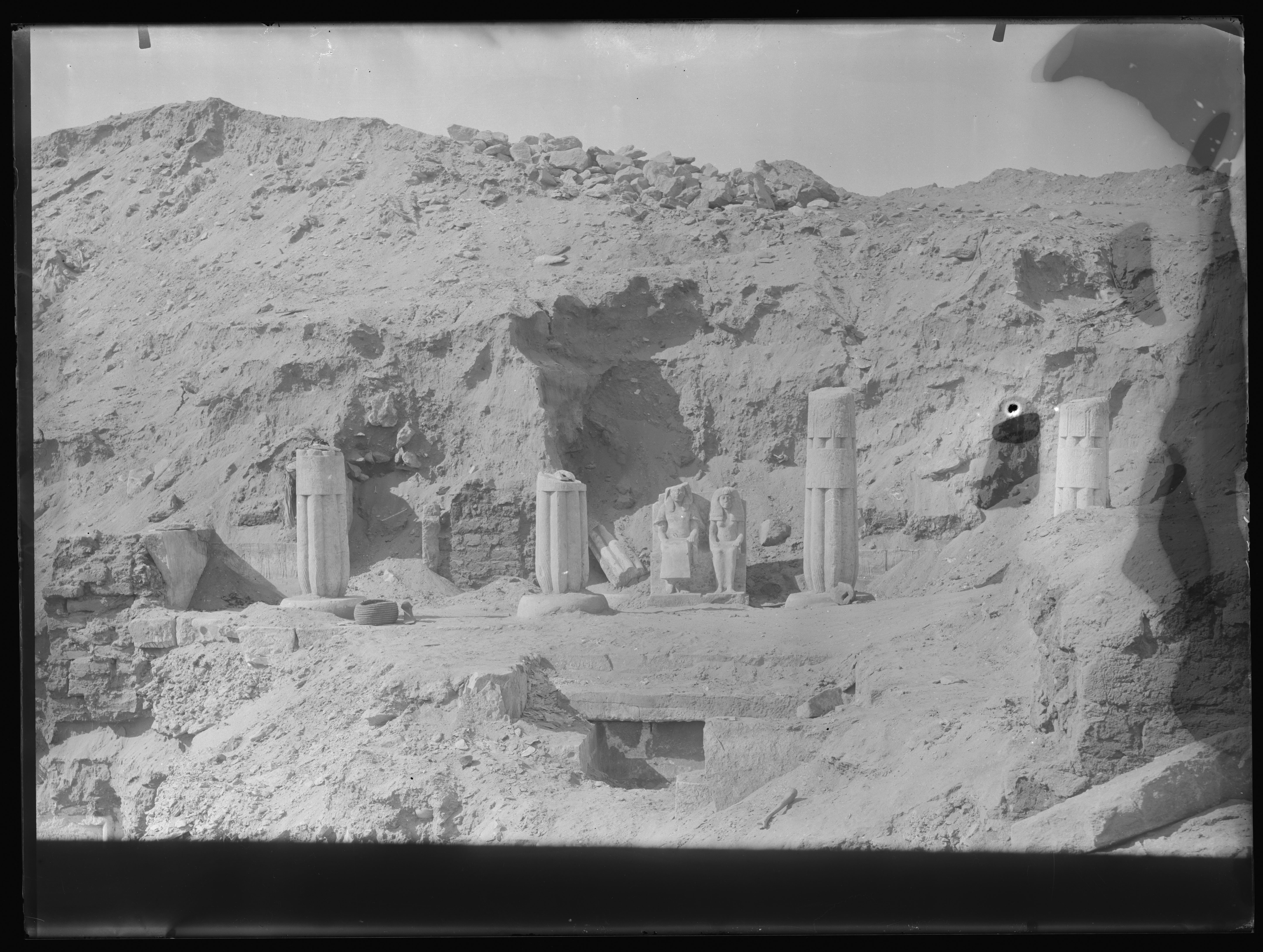 Légende manuscrite sur le protège – cliché, dans l’espace réservé à la légende, au crayon: «Saqqara ». [ Saqqara, Tombe d’Jmn-m-jnt, portique et groupe sculpté ]